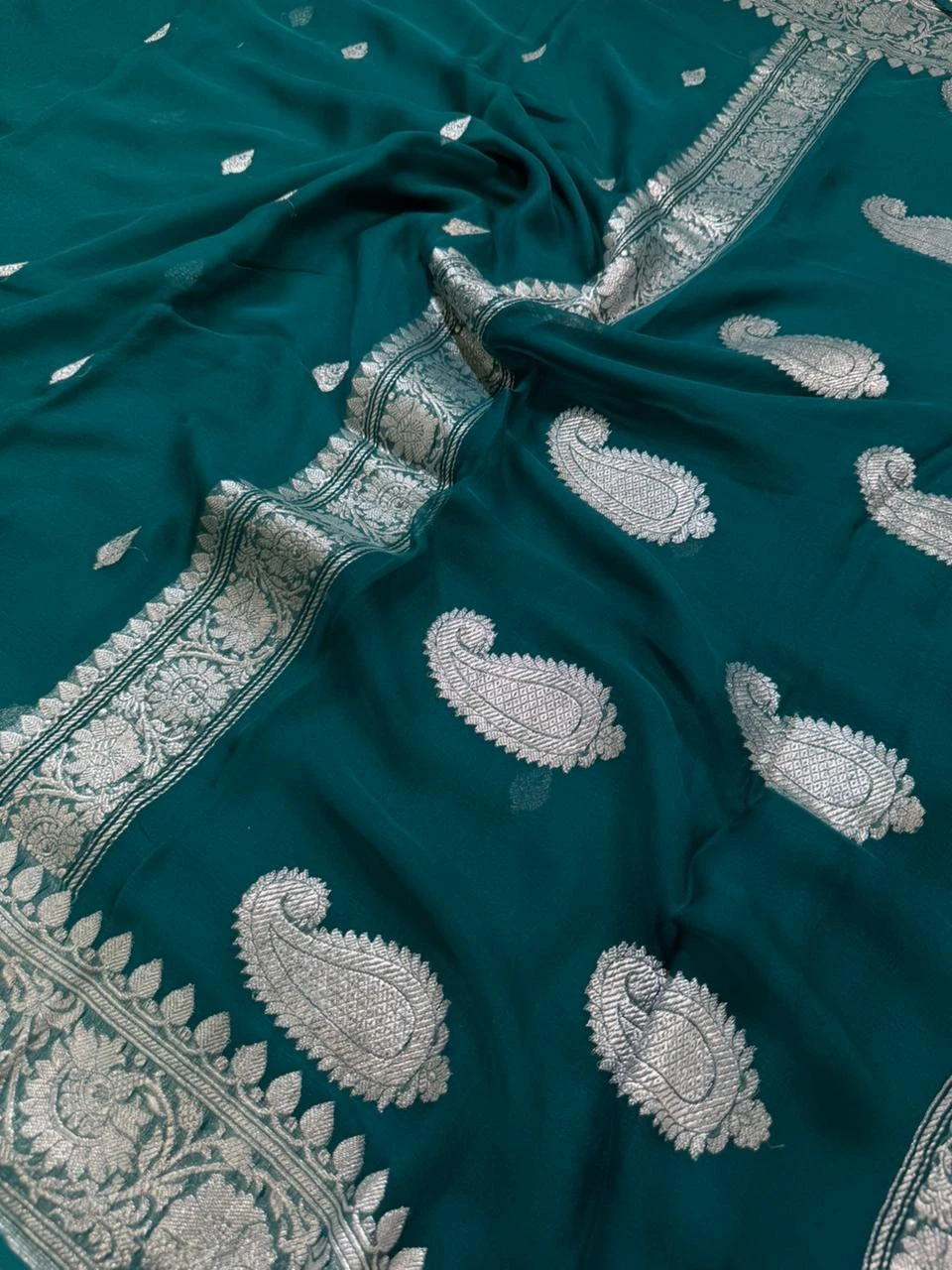 Step into sophistication with this Banarasi Pure Chiffon Saree, known for its graceful drape and subtle shimmer. The soft chiffon fabric beautifully complements the intricate zari weaving, offering a perfect blend of comfort and luxury. Ideal for festive gatherings, traditional events, or wedding wear, this saree brings out a refined and classic look that never goes out of style.
